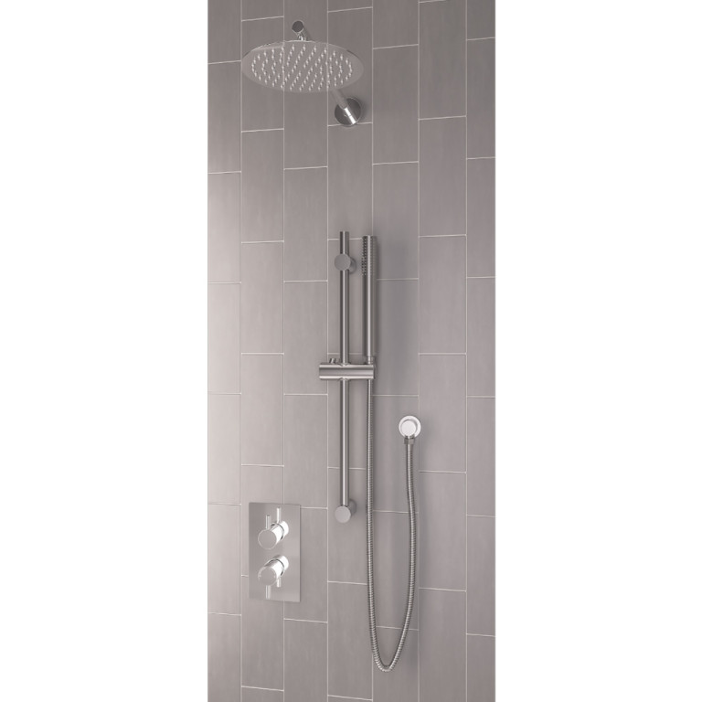 A thermostatic concealed shower valve, round fixed over head shower arm, shower head, Round riser kit with handset holder, outlet elbow & shower handset. Also Available In: