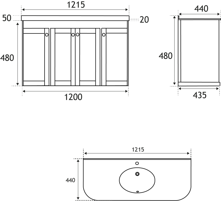 - 440mm (L) x 1200mm (W) x 480mm (H)