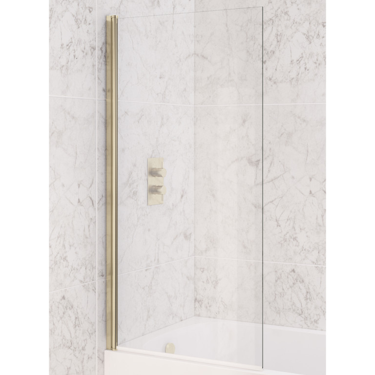 Download (0.39 MB)Designer 800 x 1400mm Beaufort Straight Bath Screen in brushed brass, with 6mm tempered glass.