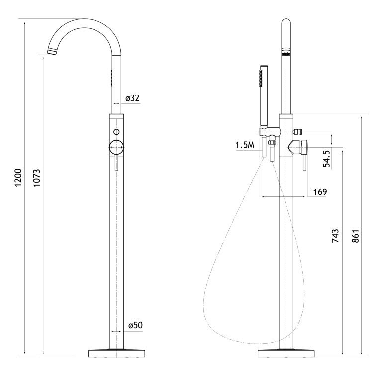 - 1200mm tall, 1073mm from floor to spout.