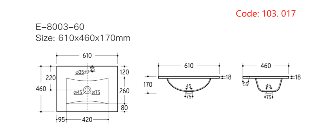 Universal 600 Basin only 1 Tap Hole - White (Vanity unit & Tap Sold Separately)